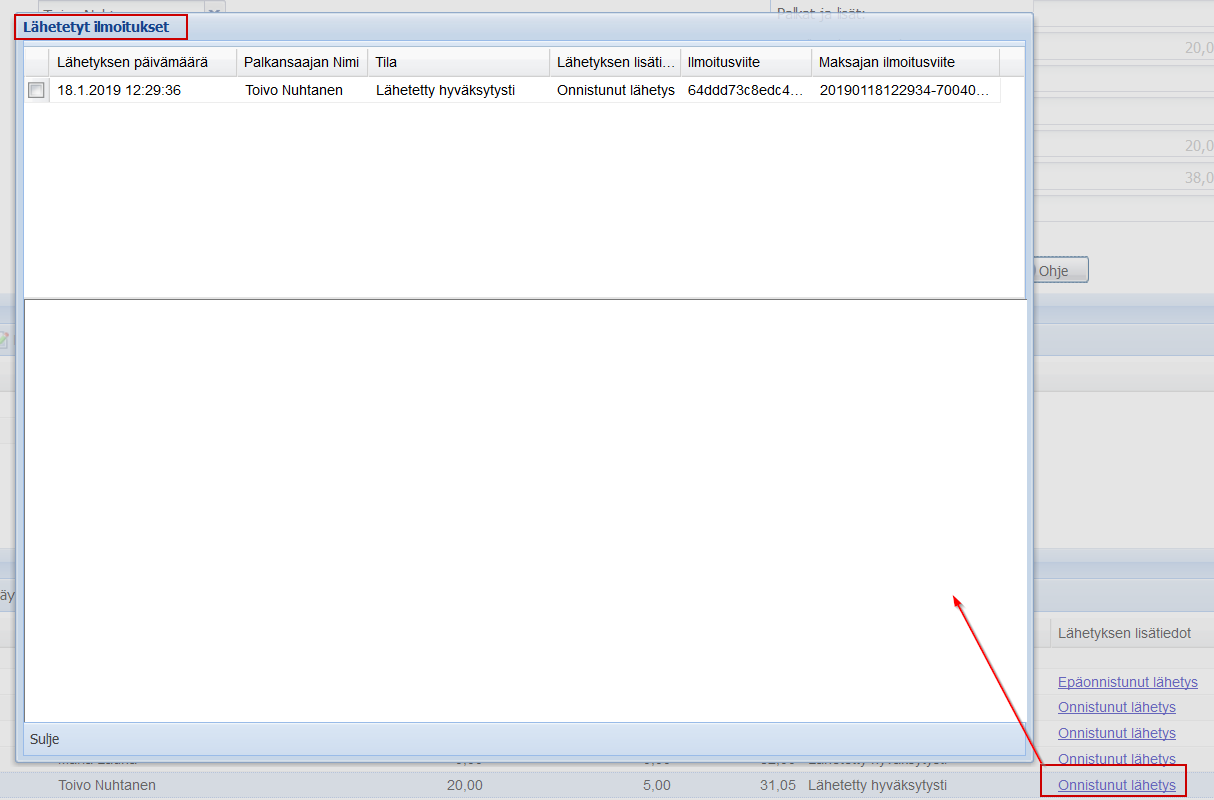 Palkkalaskenta-näytön alareunassa olevassa palkkatapahtumat-listassa on Lähetyksen lisätiedot -sarake. Sarakkeen riviteksti kertoo, onko lähetys onnistunut vai epäonnistunut. Rivitekstit Onnistunut lähetys tai Epäonnistunut lähetys ovat linkkejä, joista avautuu pop up –lähetysloki-ikkuna. Lähetetyt ilmoitukset-ikkunassa on listattuna kyseisen palkkatapahtuman lähetyshistoria. Jokaisella lähetyksellä on oma rivinsä. Klikkaamalla Epäonnistuneen lähetyksen lähetysriviä, ikkunan alaosassa näkyy lähetyksen virheet, jotka estivät onnistuneen lähetyksen.