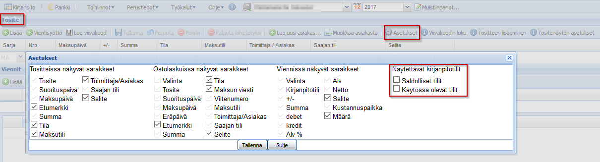 Oletuksena kirjanpitotili-valintalista sisältää kaikki tilikartan tilit. Asetuksissa voi määritellä, että listassa on valittavana vain Saldolliset tilit tai Käytössä olevat tilit. Kun saldolliset tilit on valittu, valittavana on tililista tileistä, joilla on saldoa edellisellä tai kuluvalla tilikaudella. Kaikki tilikartan tilit ovat oletuksena "Käytössä olevia". Tilin "Käytössä"-tilan voi halutessaan muuttaa Perustiedot -> Tilikartta-näytöllä.