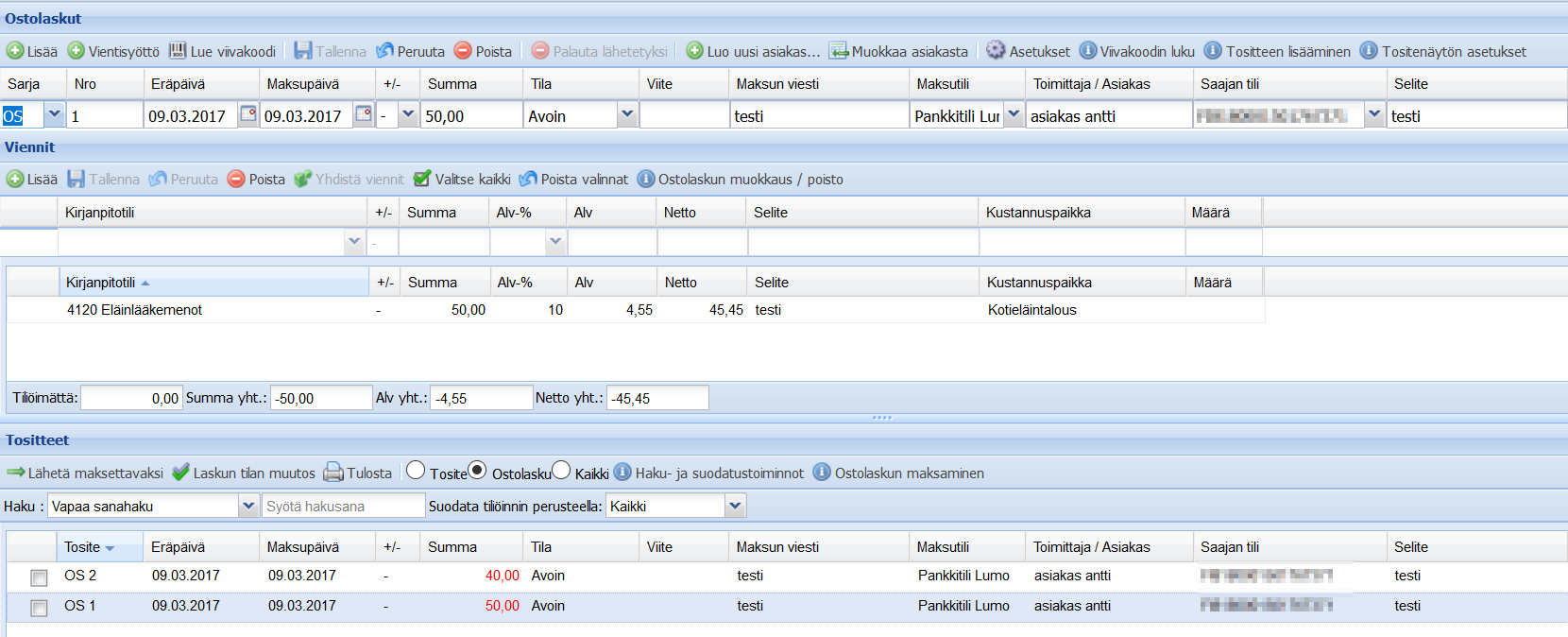 Tallennetun ostolaskun tietoja voi muokata Ostolaskut-näytöllä (Toiminnot -> Ostolaskut). Ostolaskut-näytön alareunassa on lista tallennetuista ostolaskuista. Ensin klikataan listasta sen ostolaskun riviä, jonka tietoja halutaan muokata. Ostolaskun rivi muuttuu siniseksi ja valitun ostolaskun tiedot näkyvät näytön yläosassa Tosite ja Viennit -osioissa. Tarvittaessa muokataan ensin Tositerivin tietoja ja tallennetaan muokkaus rivin yläpalkin Tallenna-painikkeesta. Tämän jälkeen voi tarvittaessa muokata vientiriviä klikkaamalla vientirivi siniseksi ja muokkaamalla rivin tietoja. Riville tehdyt muokkaukset tallennetaan vientirivin yläpuolella olevalla Tallenna-painikkeella.