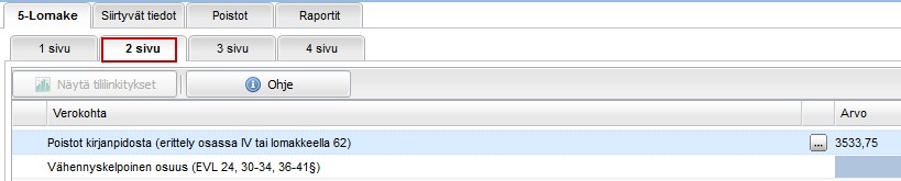 Ohjelma täyttää Poistot-välilehden omaisuus- ja poistotietojen mukaan 5-lomakkeen poistoerittelyn 2. sivun kohdassa ”5 Irtaimen käyttöomaisuuden hankintamenosta tehdyt poistot”, jos yrityksellä on vain irtainta käyttöomaisuutta. Muussa tapauksessa kentät ovat tyhjiä ja poistotiedot tulostuvat 62-lomakkeelle, joka täytyy lähettää Verottajalle. 62-lomakkeen tietoja voi tarkastella Raportit-välilehdellä valitsemalla lomakkeen ja painamalla Näytä Raportti-painiketta.