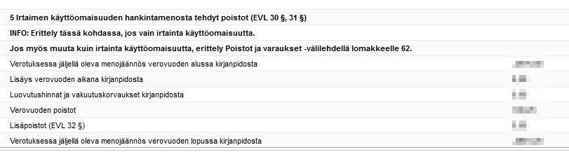 Ohjelma täyttää Poistot-välilehden omaisuus- ja poistotietojen perusteella lomakkeen kohdan ”5 Irtaimen käyttöomaisuuden hankintamenosta tehdyt poistot”, jos kirjanpidossa on vain irtainta käyttöomaisuutta. Tietoja voi muokata muokkaamalla Poistot-välilehden tietoja.