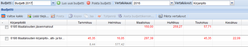 Valitsemalla vertailukauden, voi verrata budjetin lukuja aiempiin kirjanpitoihin tai budjetteihin. Tässä esimerkissä verrataan 2017 vuoden budjetin lukuja 2016 kirjanpidon lukuihin. Kirjanpidon vertailuluvut näkyvät budjetin lukujen alapuolella harmaalla.