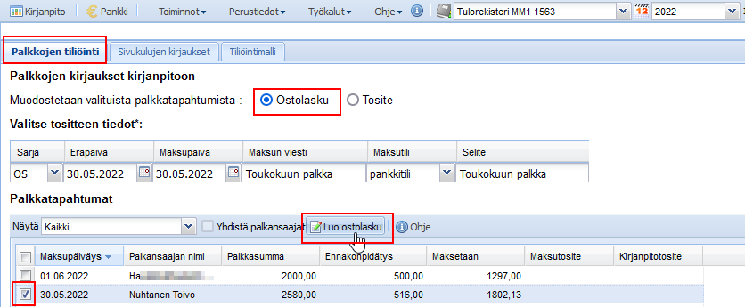 Luo ostolasku -painikkeesta ohjelma muodostaa kirjanpitoon yhden ostolaskun jokaisesta valitusta palkkatapahtumasta. Merkkinä onnistuneesta ostolaskun luonnista, ohjelma päivittää näytön Palkkatapahtumat -taulukon Maksutosite -sarakkeeseen ostolaskun tunnuksen. Tunnus on linkki, jonka klikkauksesta ohjelma avaa ponnahdusikkunan, jossa näkyy ostolaskun tiedot. Tarvittaessa ostolaskun tietoja voi muokata ikkunassa. Tarvittaessa ostolaskun poiston voi tehdä vain varsinaisella Ostolaskut -näytöllä.