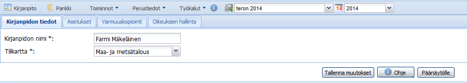 Kirjanpidon tiedot osiossa voit vaihtaa Kirjanpidon nimeä ja kirjanpidossa käytettävää Tilikarttaa. Muutettuasi tietoja paina lopuksi Tallenna muutokset.